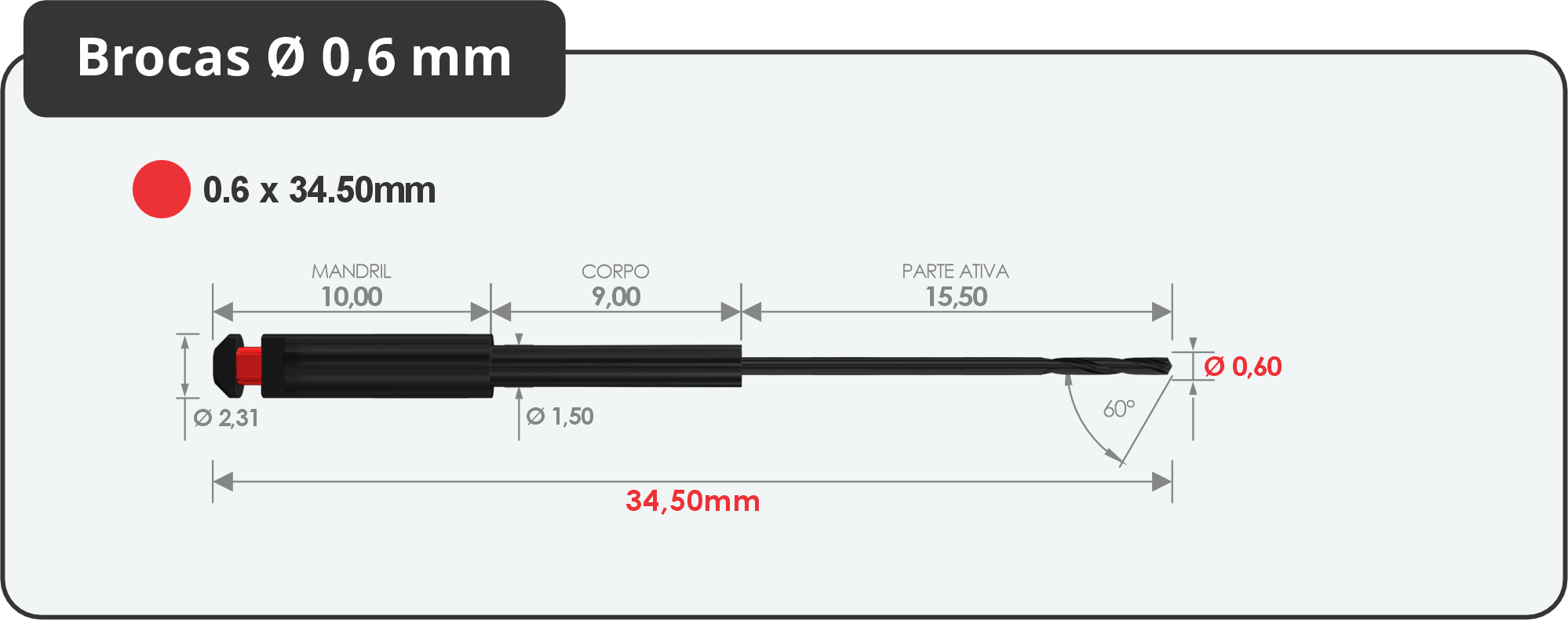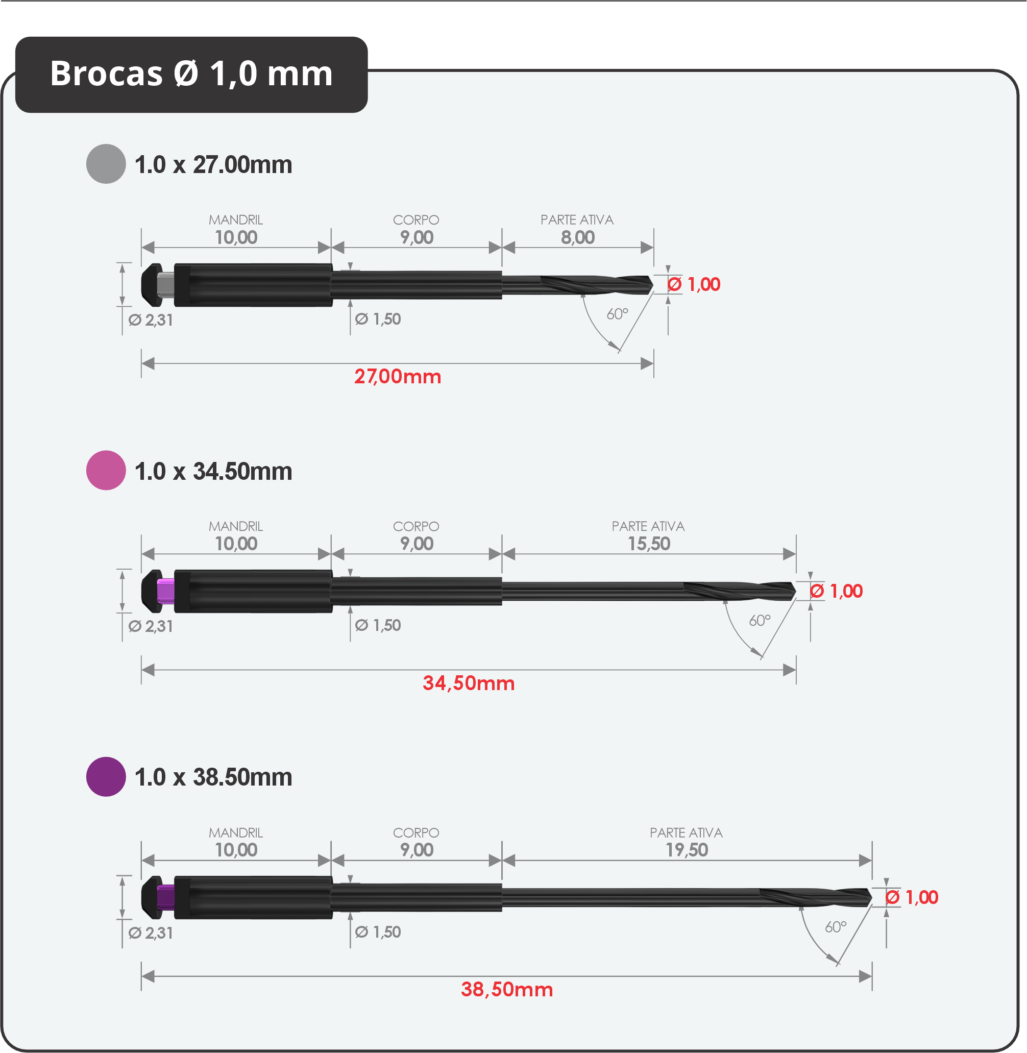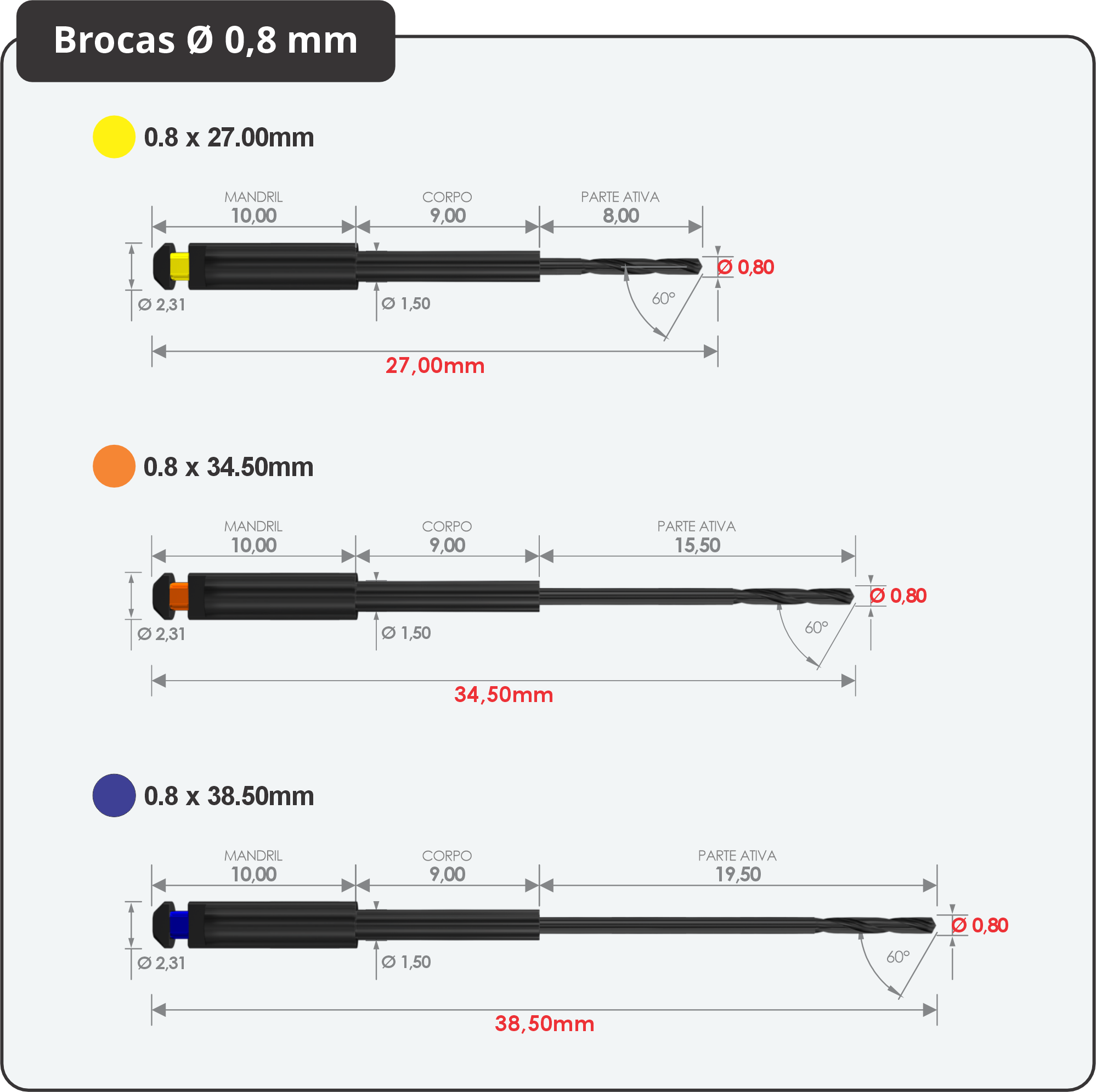 Desenvolvemos sete (7) brocas com três (3) diâmetros: 1 mm, 0,8 mm e 0,6 mm; e três comprimentos de trabalho: 17 mm, 24,5 mm e 28,5 mm para uso gradativo do diâmetro maior para o menor permitindo acessar todos os diâmetros e comprimentos de raízes e canais.