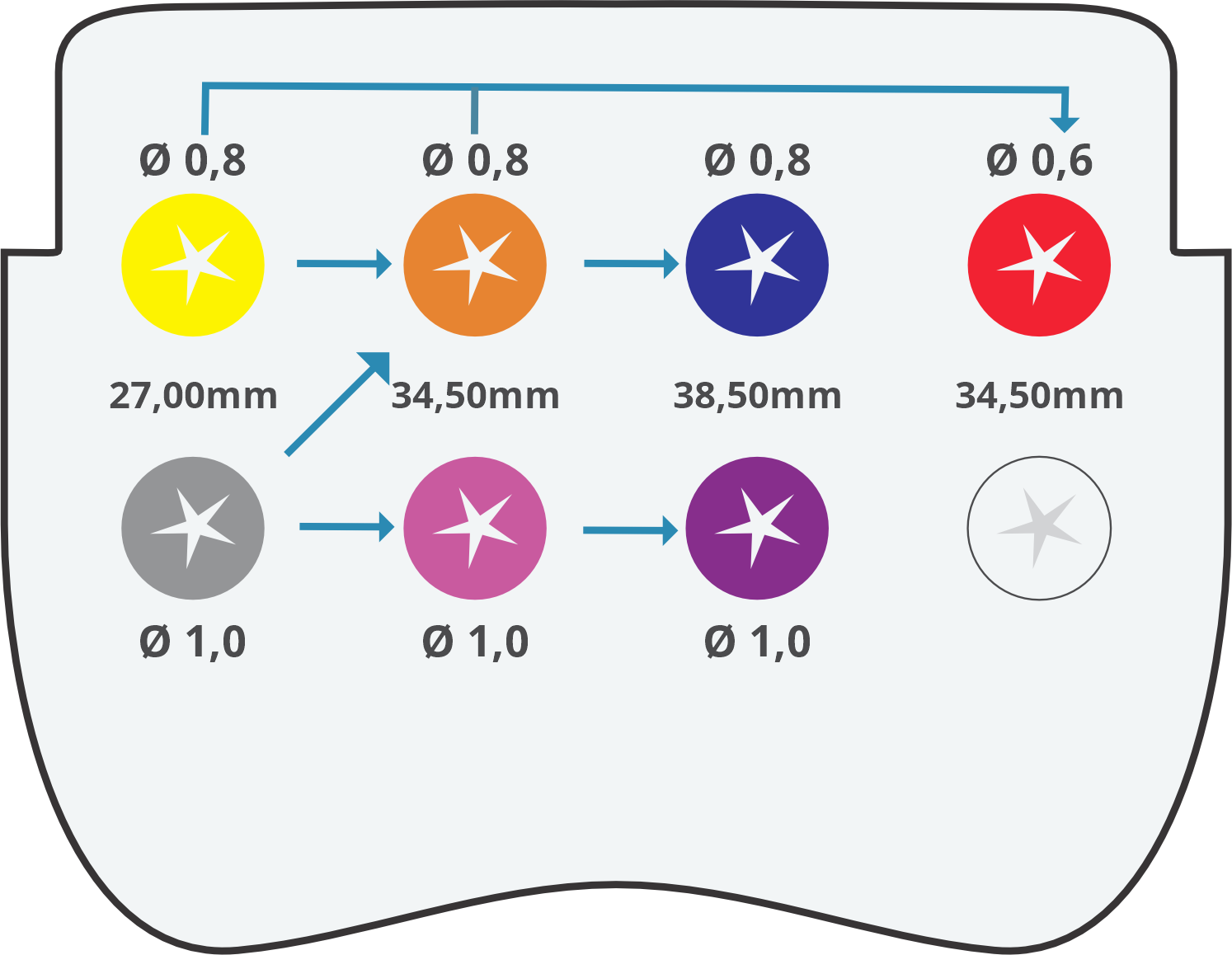 A segurança de não haver desvio no escalonamento, também ocorre pelo encaixe corpo/anilha, sempre idêntico em toda a troca de broca. Configurações das brocas e do off set das anilhas na geração da guia fazem a broca subsequente somente alcançar o ponto final da anterior quando o corpo adentrar 2 mm na anilha, garantindo que o trajeto da broca subsequente sempre seja o mesmo da anterior. Com este mecanismo, mesmo que o operador queira mudar o trajeto da broca, não conseguirá.
