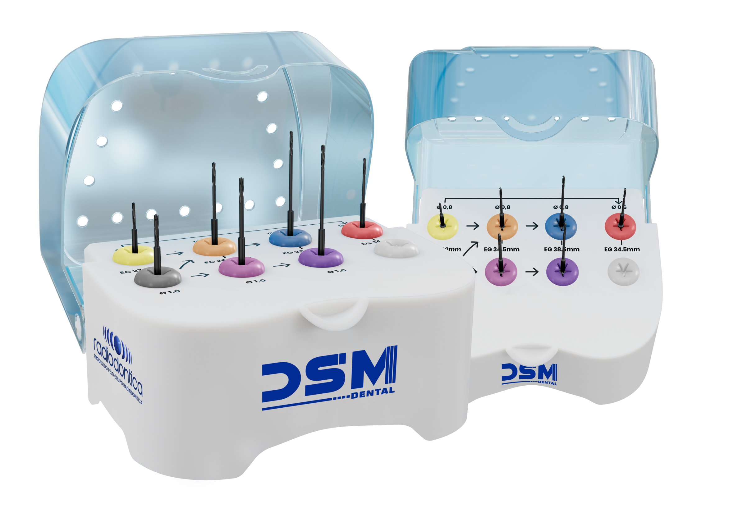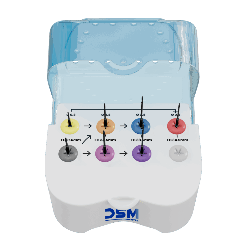 Com nomenclatura EG (Endodontia Guiada) as brocas são dispostas em estojo autoclavável com cores correspondentes aos slots e sinalização da sequência a ser seguida.