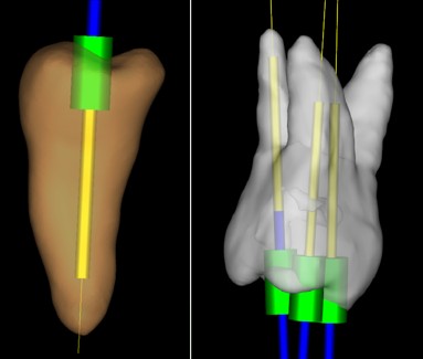 Diâmetro, comprimento e sequência de brocas são selecionadas conforme extensão da calcificação e diâmetro dos canais por meio de exame tomográfico. Em software 3D é feito planejamento do direcionamento e profundidade que as brocas devem adentrar para ultrapassar a calcificação ou desgastar o PFV. Uma guia endodôntica é impressa que posicionada sobre a arcada dentária transfere o planejamento realizado para o profissional realizar acesso guiado, evitando desvio com reduzida remoção de dentina, sem fragilizar as raízes, permitindo tratar dentes que seriam removidos.