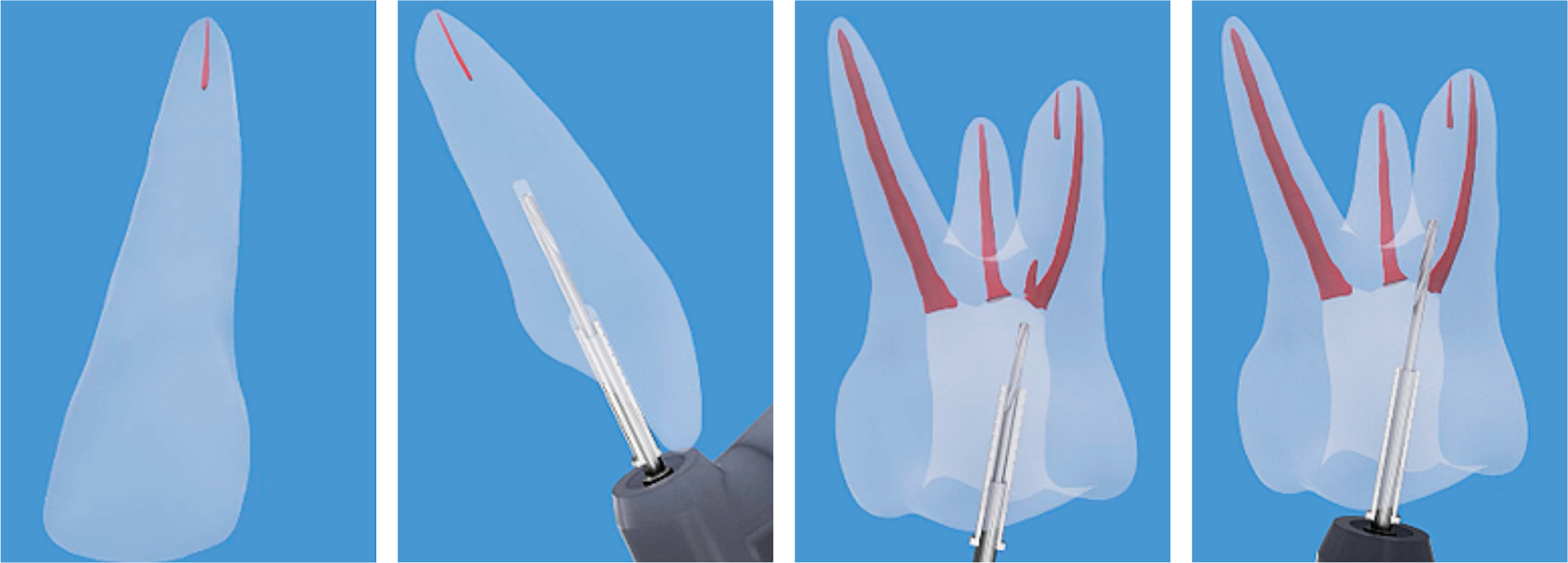 Sistema especialmente desenvolvido para a Endodontia, com metodologia e ferramentais para o endodontista ultrapassar calcificações de diferentes diâmetros e comprimento de canal; e remover pinos de fibra de vidro (PFB) de maneira precisa, rápida e segura.