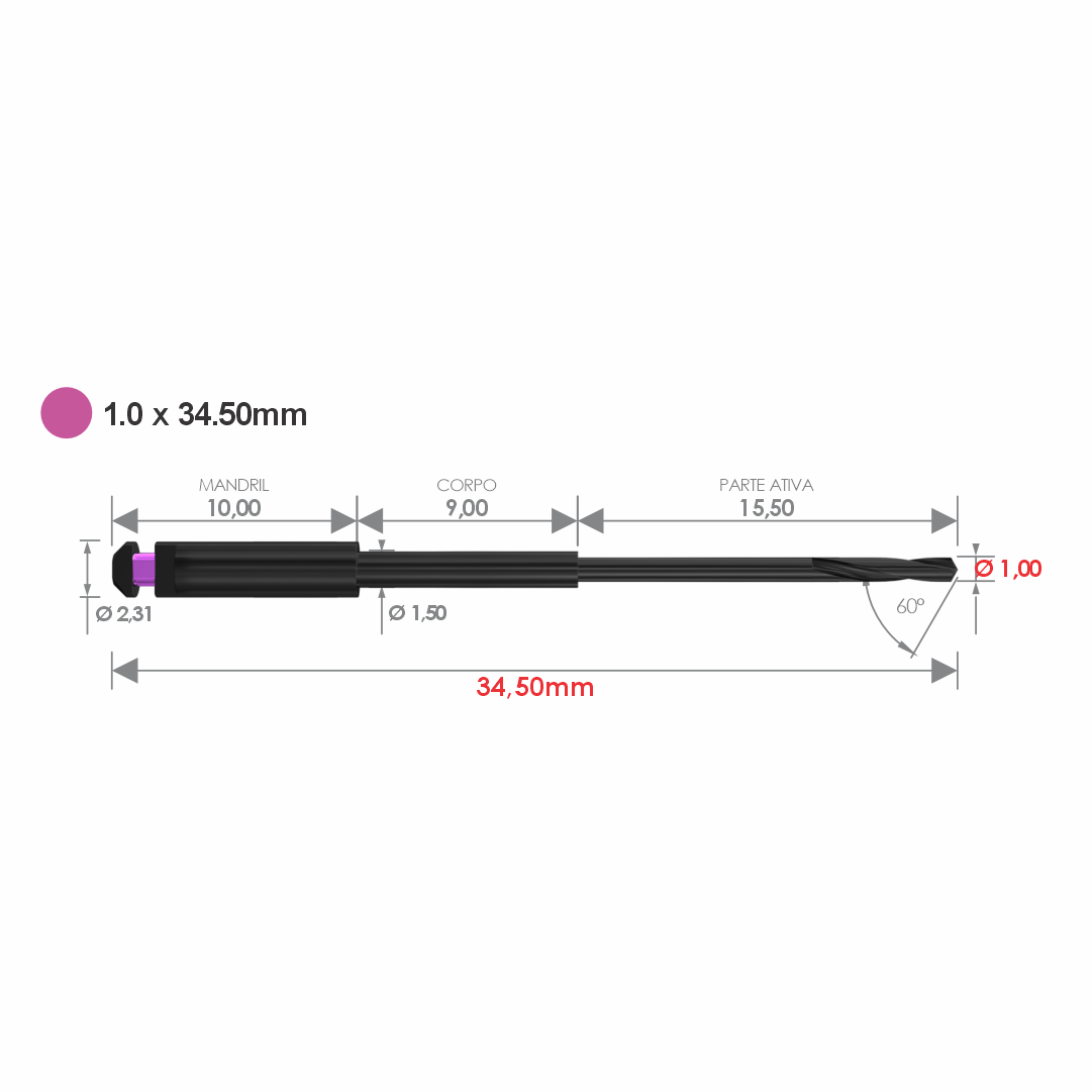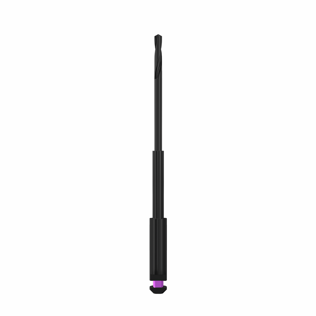 Com diâmetro de 1,0 mm , proporciona acesso seguro e controlado após a fase inicial realizada com guia de broca. Seu comprimento de 34,50 mm permite alcançar calcificações que se estendem até o terço médio radicular, seguindo rigorosamente o planejamento tomográfico realizado em software 3D.